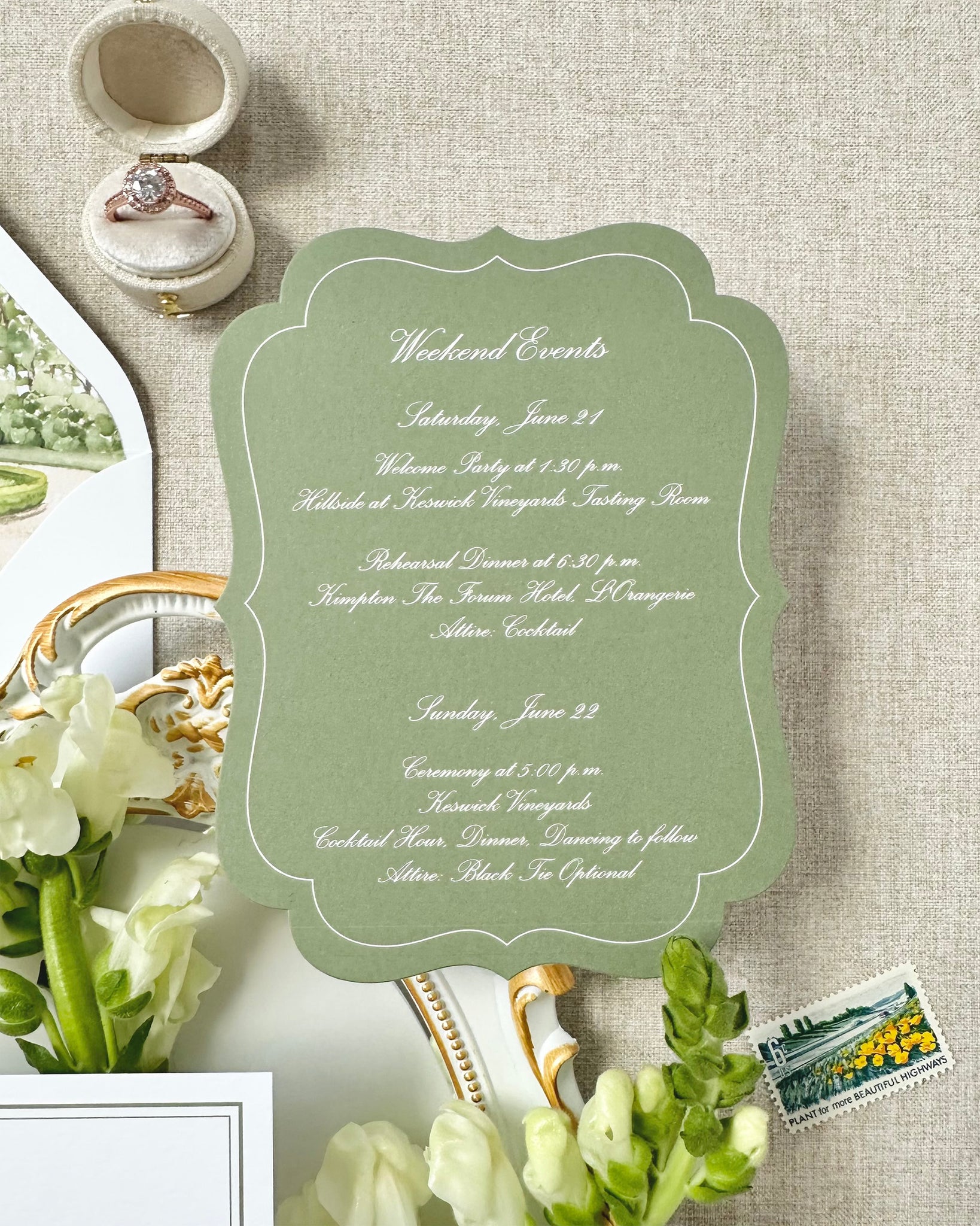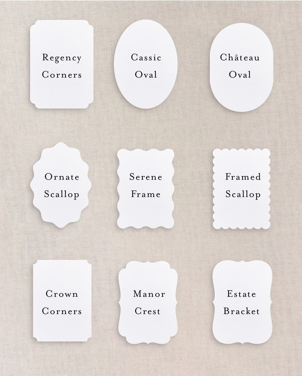 Choose from timeless shapes like arched, scalloped, or oval to add a touch of soft romance or modern edge to your suite. Each card is precision-cut and printed on luxury cardstock to match the rest of your invitation design seamlessly.
